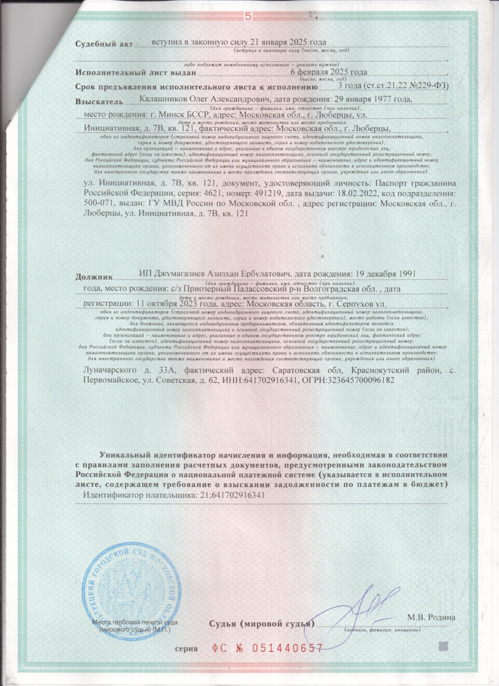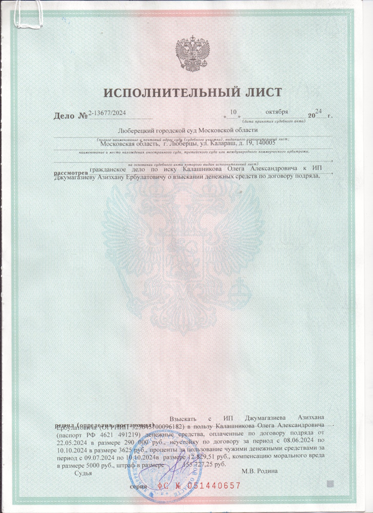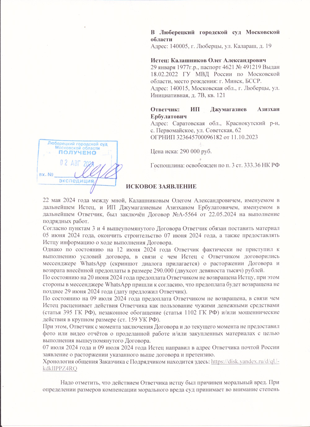| Калашников Олег Александрович | ИП Джумагазиев А.Е. | Люберецкий городской суд МО Иск: стр 1, стр 2 |